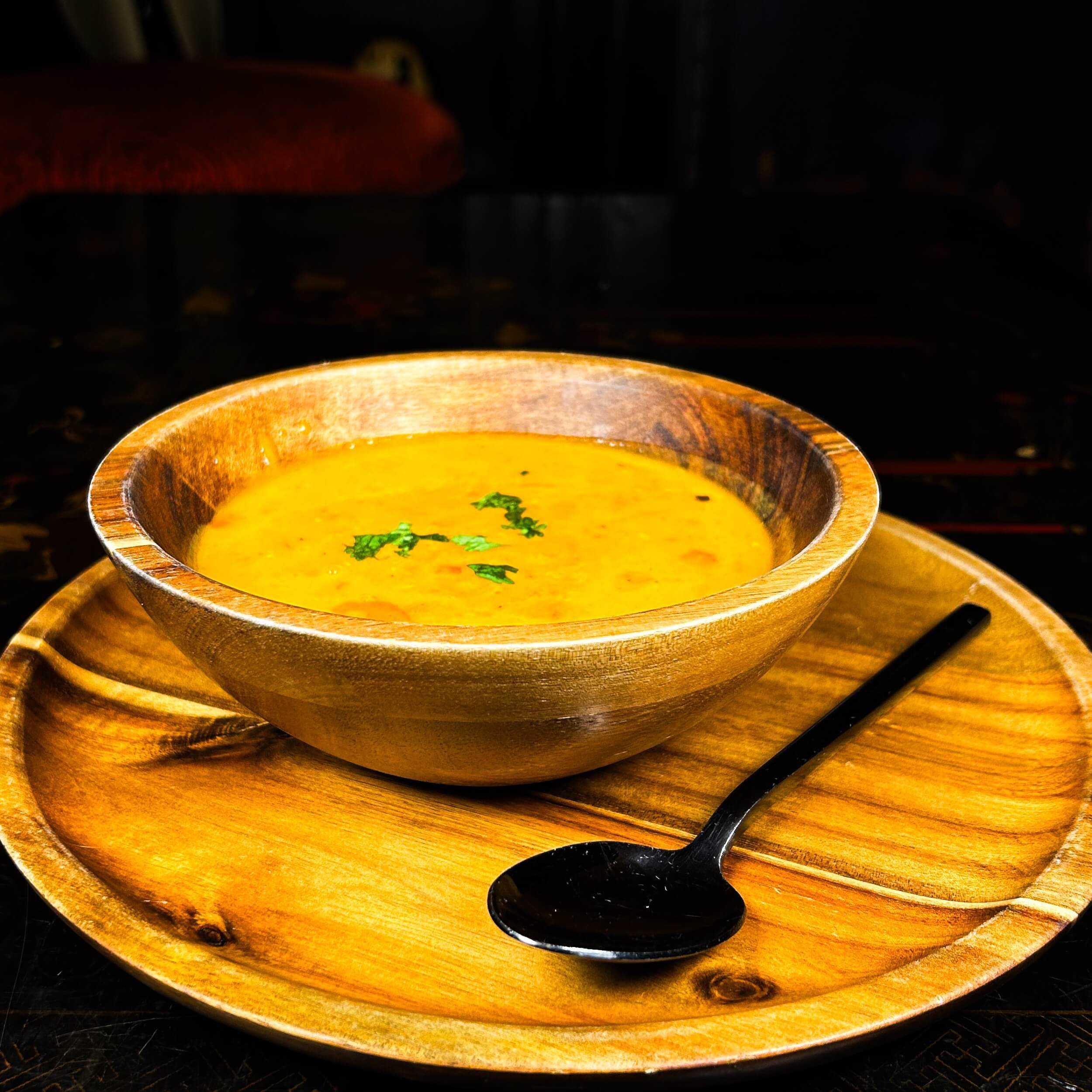 Rich, velvety tomato bisque slow-simmered with herbs, cream, and a touch of garlic.